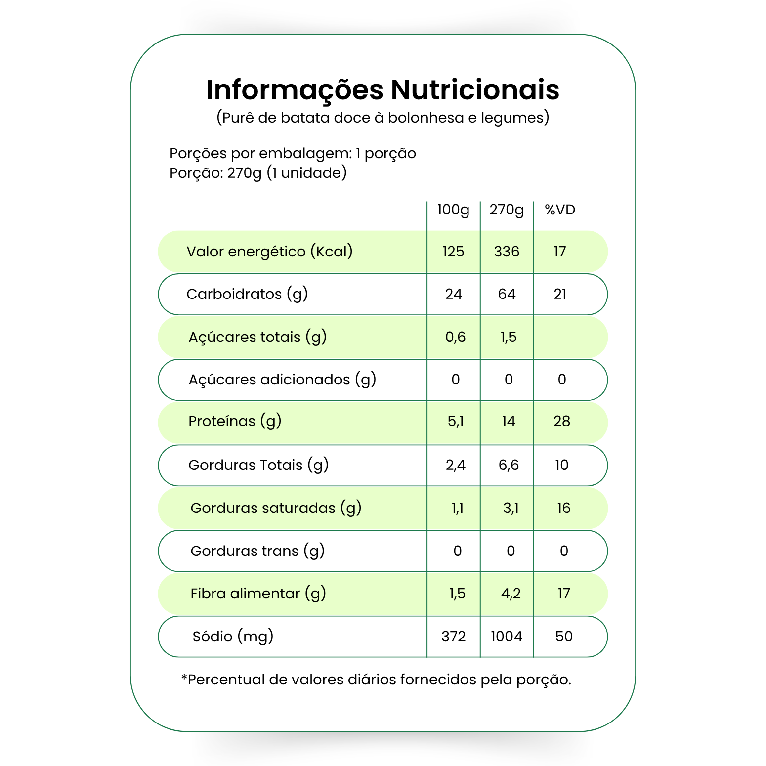 INGREDIENTES: Batata doce, molho de tomate, carne bovina moída, leite integral, seleta de legumes (vagem, ervilha, brócolis e cenoura), cebola, manteiga, sal, páprica defumada, cebola em pó, alho em pó, colorau, orégano, salsinha desidratada, alho triturado, amido modificado e azeite de oliva.